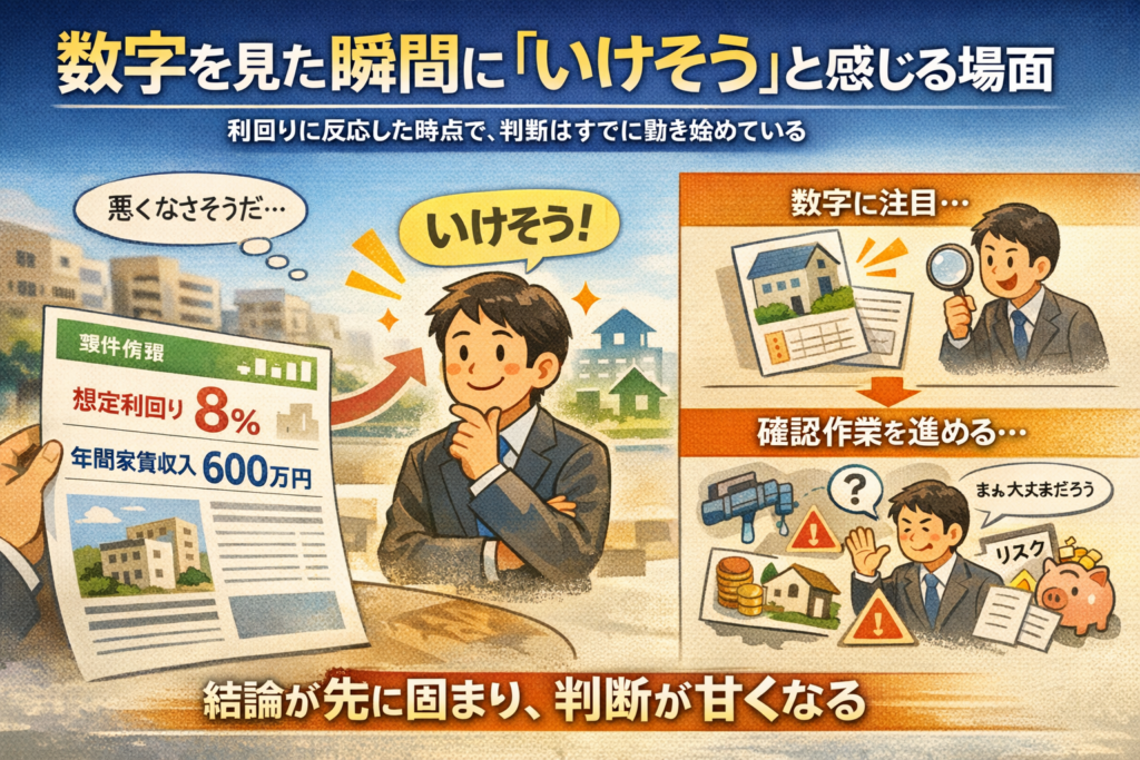 数字を見た瞬間に「いけそうだ」と感じ、その印象を前提に物件全体を見始めてしまうと、判断の順番が逆になります。